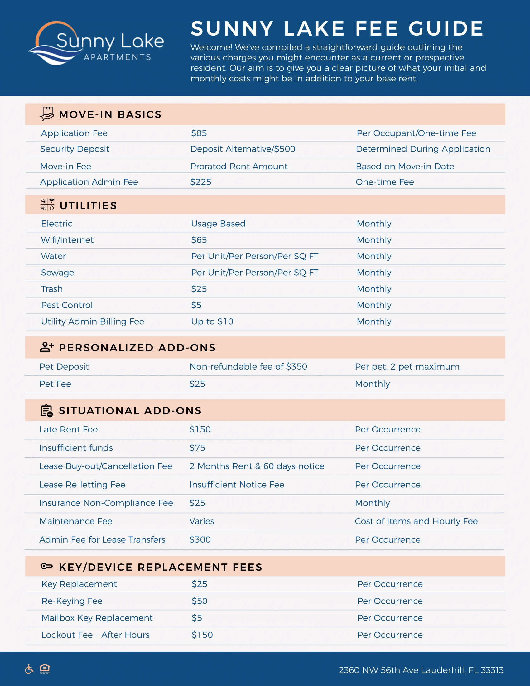 A fee guide for Sunny Lake Apartments outlining various charges for move-in basics, utilities, personalized add-ons, situational add-ons, and key/device replacement fees.
